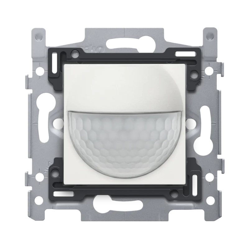 Binnenbewegingsmelder 180° met schakelcontact 10 A, 230 V, 8 m, white. De bewegingsmelder heeft een waarnemingshoek van 180° horizontaal en 60° verticaal waarin elke beweging gedetecteerd wordt. Bij een detectie van een beweging worden zoals je wenst vooraf bepaalde lichten geactiveerd. De centraalplaat is vervaardigd uit vormvaste polycarbonaat + asa. De grondstof is in de massa gekleurd. Kleur: white hoogglans (in de massa gekleurd, bij benadering RAL9003)De contactbussen zijn uitgerust met schroefklemmen voor het vastklemmen van de draden. Bij het bevestigen in een inbouwdoos met grijpvlakken maakt men gebruik van klauwen die opengedraaid worden d.m.v. schroeven met een sleufkop (sleuf 0,8 x 5 mm). De klauwen, die een ingrijpdiepte van 31 mm hebben, keren volledig terug bij het losschroeven. 2 x 1,5 mm² of 1 x 2,5 mm² per aansluitklem Het inbouwraam heeft een metaaldikte van 1 mm en is na het snijden verzinkt op alle zijden, ook op de snijzijden. Op de horizontale en verticale as heeft het inbouwraam 4 inloopsleuven voor bevestiging in inbouwdozen met schroeven. Deze inloopsleuven hebben een schroefgat van 7 mm. Voor montage op panelen is het inbouwraam voorzien van 4 schroefgaten (aangeduid met een schroefsymbool) met een diameter van 3 mm. Het midden van het inbouwraam is, zowel in horizontale als in verticale richting, aangeduid (krijtlijn, laser …) zodat de montage van één of meerdere mechanismes vlot en eenvoudig kan verlopen. Aan de rechter- en linkerzijde heeft de sokkel omhooggeplooide zwaluwstaarten waardoor horizontaal koppelen van meerdere sokkels snel en perfect verloopt. De omhooggeplooide randen aan de buitenzijde van de sokkel alsook de doorzetting naar binnen toe zorgen voor extra robuustheid. Je kunt de sokkels verticaal koppelen met een centerafstand van 60 mm door ze in elkaar te schuiven. Ze vergrendelen zich automatisch. Voor het verticaal koppelen van sokkels met een centerafstand 71 mm, is de sokkel onderaan voorzien van twee voorgevormde lipjes. Door deze lipjes naar beneden te plooien over een afstand van 1 mm, steunt deze perfect op de onderste en is de centerafstand van 71 mm gewaarborgd. Het inbouwraam is bovenaan en onderaan voorzien van een donkergrijze opzetboord van kunststof. Deze boord is vervaardigd uit pc+asa en is via een smeltproces met het inbouwraam verbonden. De hoeken van de twee opzetboorden zijn voorzien van rechthoekige openingen (7,9 x 1,5 mm) waarin zich telkens een multipositionele snaphaak bevindt.De 4 rechthoekige openingen zorgen ervoor dat bij onzorgvuldig pleisterwerk de afdekplaat steeds vlak tegen de muur bevestigd kan worden dankzij de snaphaken. Dit werkt in twee richtingen: als de inbouwdoos uit het pleisterwerk steekt, vangen de multipositionele snaphaken een speling tussen 1 à 1,2 mm op; als de inbouwdoos te diep in het pleisterwerk verzonken is, dan kunnen de snaphaken een speling tot 1,8 mm opvangen. De opzetboorden zijn eveneens voorzien van 4 ronde openingen die ervoor zorgen dat de afdekplaat correct gepositioneerd kan worden ten opzichte van de centraalplaat.