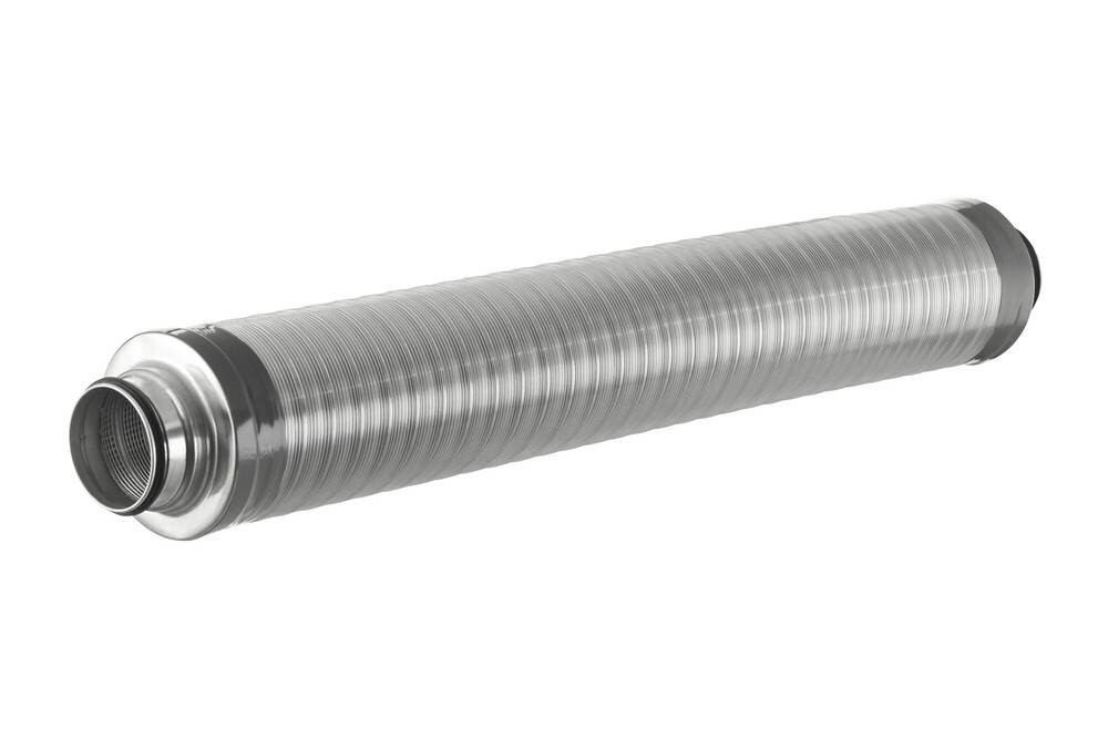 Duco. DucoFlex. De DucoFlex Silencer half star D200 (M/M) is een half starre (buigbare) geluidsdemper die bestaat uit een geprofileerde en geperforeerde aluminium binnenkanaal en een twee-lagig geprofileerde buitenmantel. De ruimte tussen de binnen- en buitenmantel is opgevuld met 50 mm geluidsabsorberend materiaal. De demper is standaard voorzien van aluminium eindkappen aan beide uiteinden (2xM connectie). Hierdoor kan de demper snel, eenvoudige en luchtdicht aangesloten worden op de ventilatie-unit of de starre ventilatiekanalen van diameter D200.
